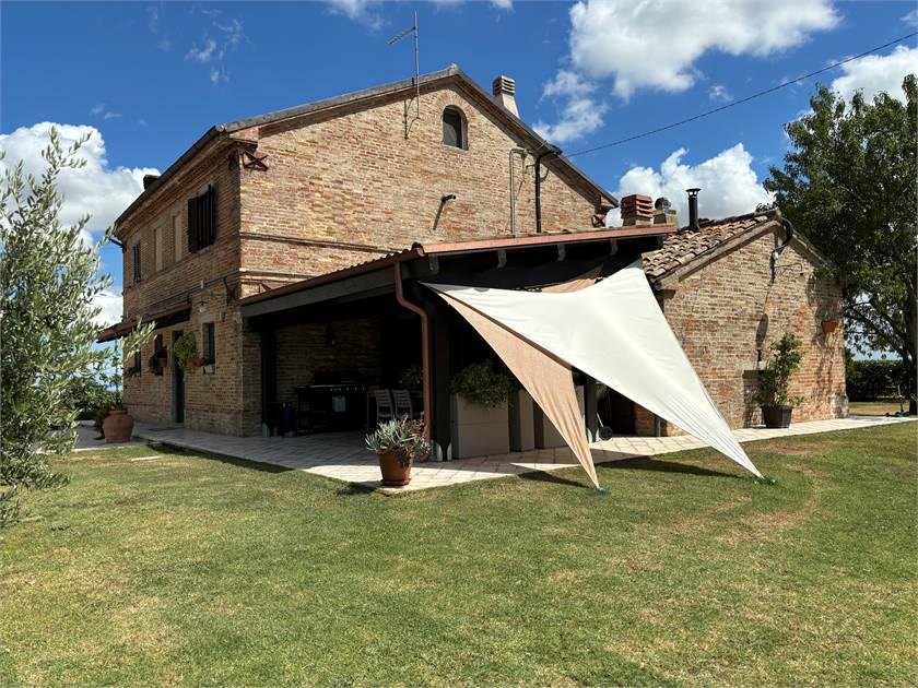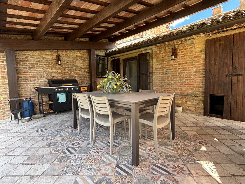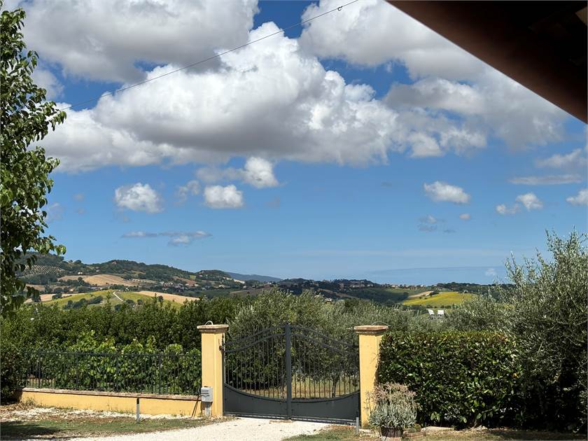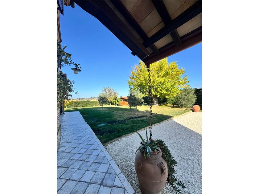 L'esterno della casa è un insieme di colori e la vista panoramica spazia dai monti fino a un piccolo scorcio di mare, la piscina esterna, il pergolato attrezzato il grande gelso dove sdraiarsi per lasciarsi coccolare nella quite della campagna lontano dal traffico. Varie le dotazioni di questo immobile per un maggior confort, dall'impianto fotovoltaico, l'irrigazione esterna con utilizzo dell'acqua di accumulo grazie all'impianto di depurazione per trattamento acque reflue e il riscaldamento con caldaia a pellet .